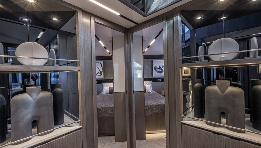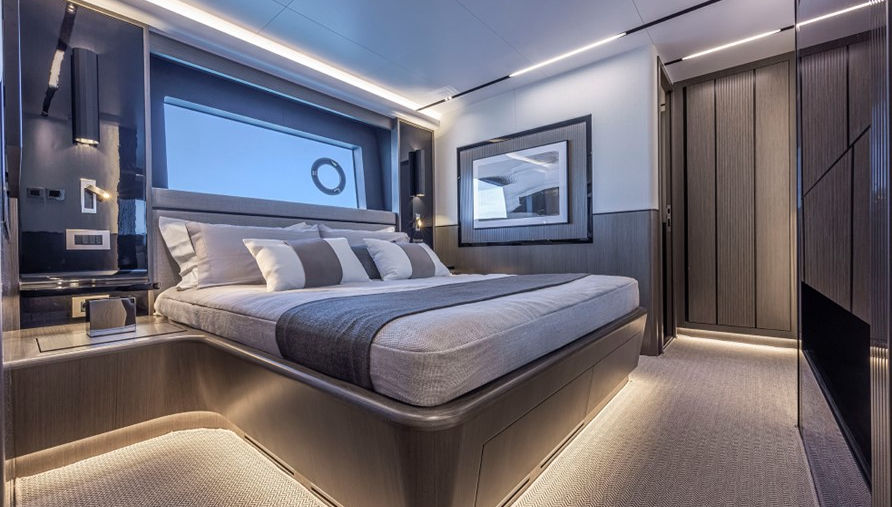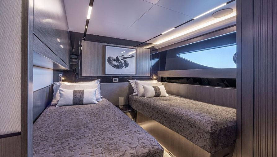 PEARLY SPENCER features a full-beam owner’s suite on the main deck, four en-suite guest cabins, and accommodation for up to 12 guests. Her Kelly Hoppen “Indulgence” interior brings a refined, contemporary luxury throughout.