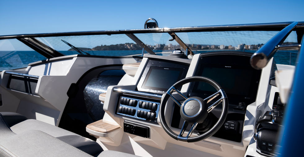 Powered by twin Volvo Penta D6-400 engines with joystick docking and Humphree interceptors, she delivers cruising speeds over 30 knots with excellent control and economy. Deck features include teak-laid cockpit and bathing platform, bimini, wet bar with BBQ and fridge, foredeck sun pad, aft sunpad with adjustable backrest, and a tender garage, making her ideal for day trips or longer cruises.